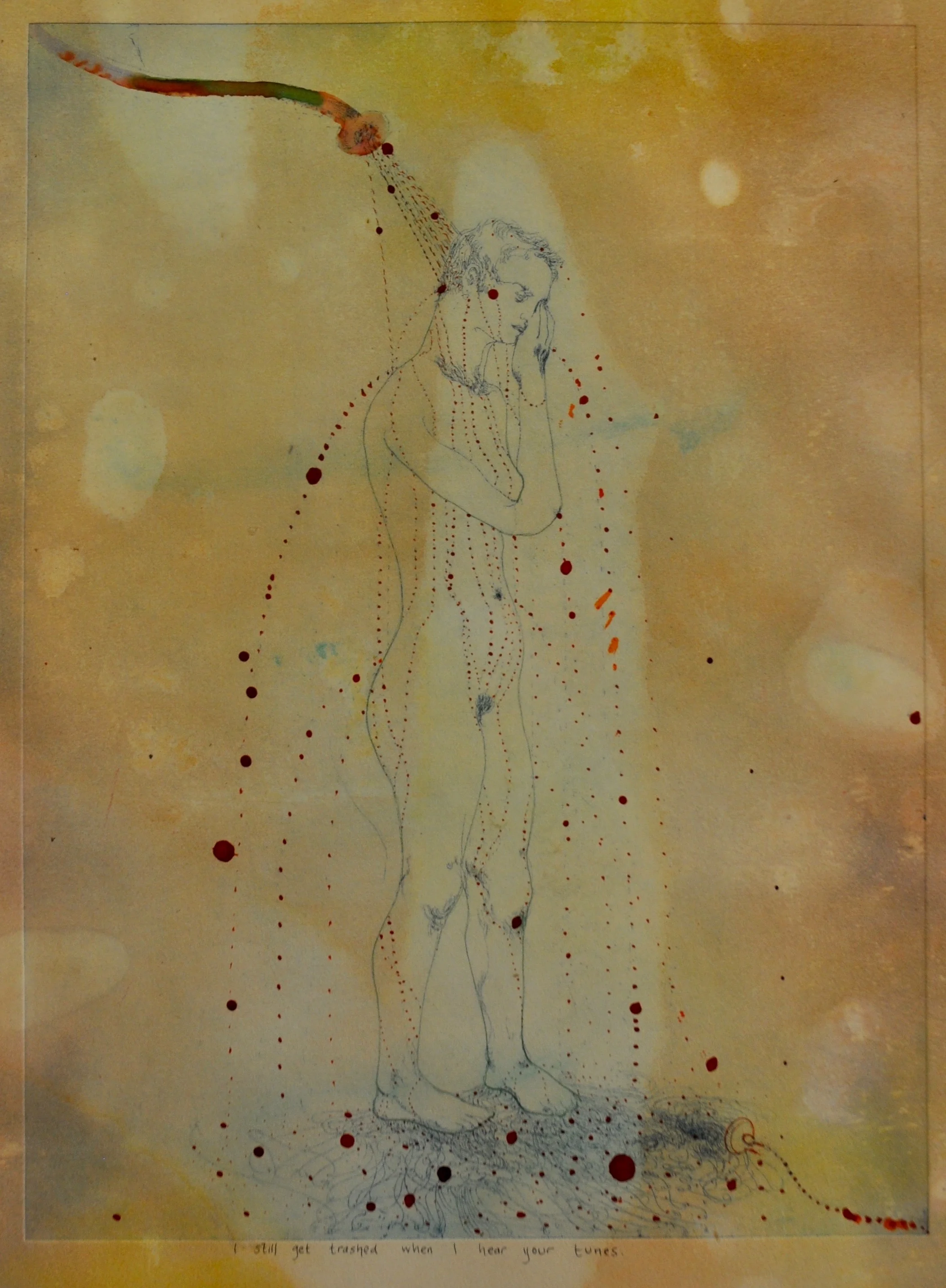 ‘ I still get thrashed when I hear your tunes’ etching with watercolour and hand painter ink unique version , 65x 50cm